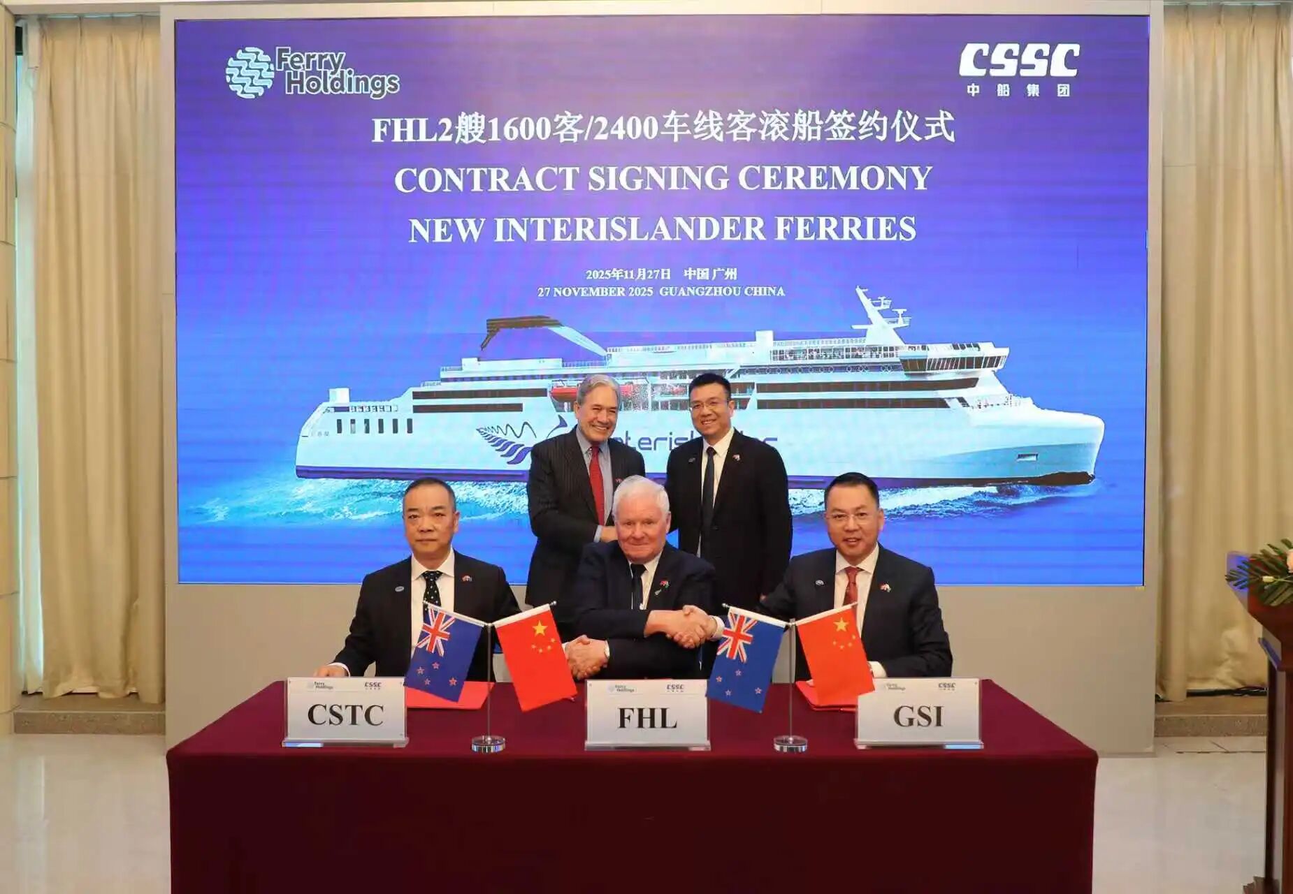 11月27日,中國船舶集團(tuán)有限公司旗下廣船國際有限公司攜手新西蘭FHL(Ferry Holdings)公司簽署2艘新型客滾船建造合同。當(dāng)天簽約的客滾船項(xiàng)目,是連接中新兩國友誼的重要紐帶。在中船集團(tuán)與FHL公司攜手推動下,雙方共贏合作邁出了關(guān)鍵一步。