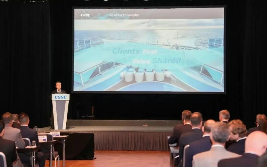 王國強向全球主要船東和合作伙伴宣講了“中船集團 智領深藍”的企業(yè)品牌理念,闡述了中船集團未來十年的“高端化、綠色化、智能化、共享化”戰(zhàn)略規(guī)劃方向,以及與全球廣大船東用戶“開放合作、共創(chuàng)共贏”的經(jīng)營理念。他強調(diào),作為全球船舶市場綠色低碳發(fā)展的引領者、踐行者和先行者,中船集團始終堅持創(chuàng)新驅(qū)動的發(fā)展理念,以構(gòu)建海洋命運共同體為使命,持續(xù)加快核心技術協(xié)同攻關,不斷深化與全球航運企業(yè)及國際海事界的多贏合作。